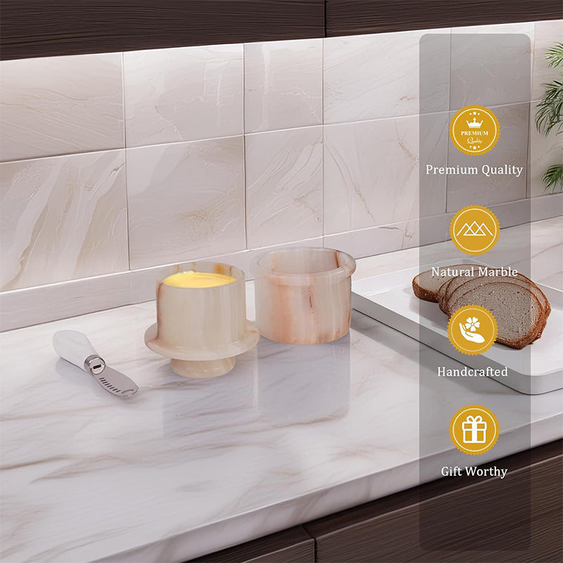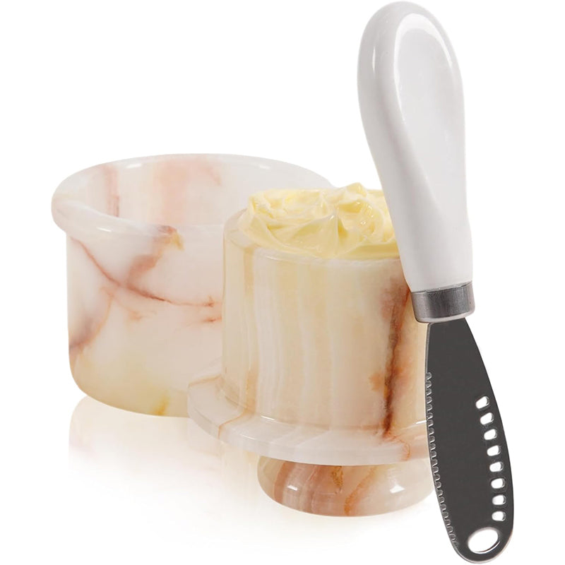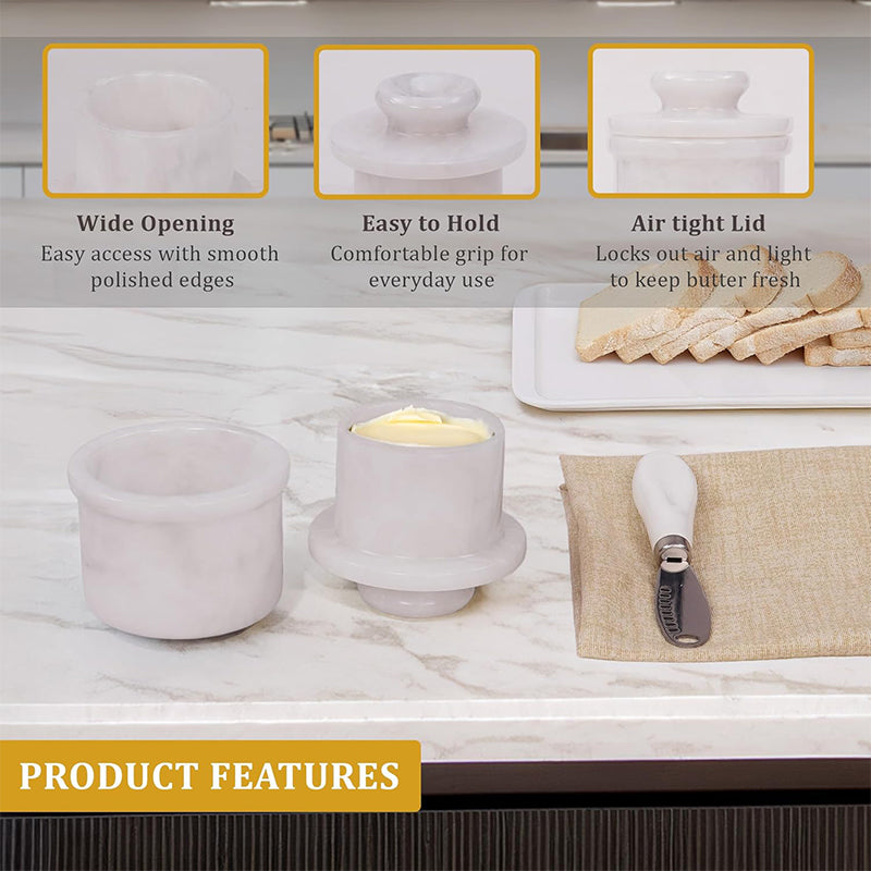 Natural Marble: Crafted from high-quality marble. Dimensions: Butter Keeper - Dimensions: 4.25" height, 4" diameter, 3" inner diameter, 3.8 oz capacity Knife - 5.25" length, 1" width