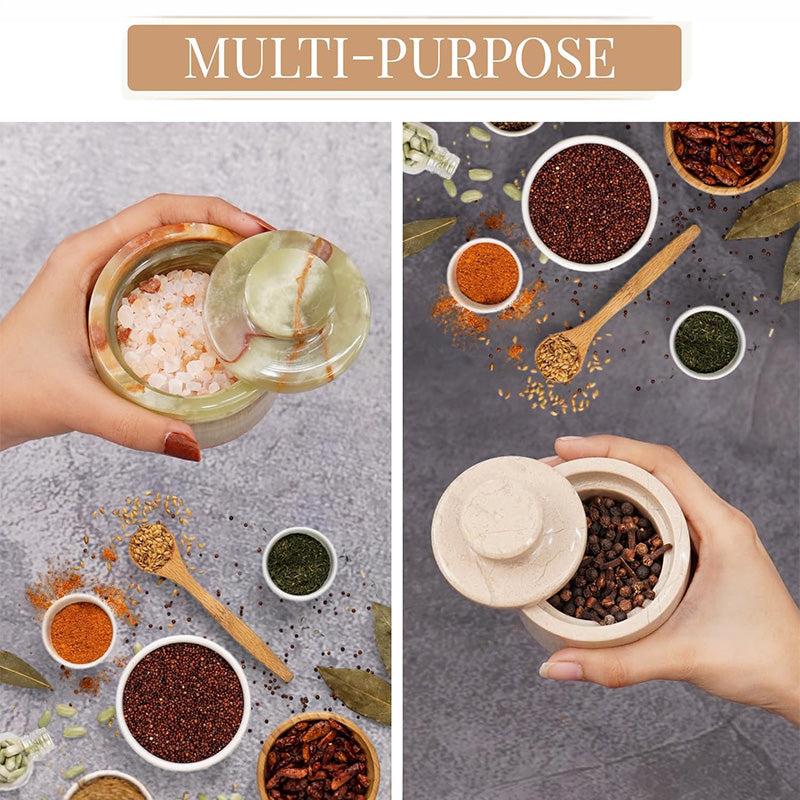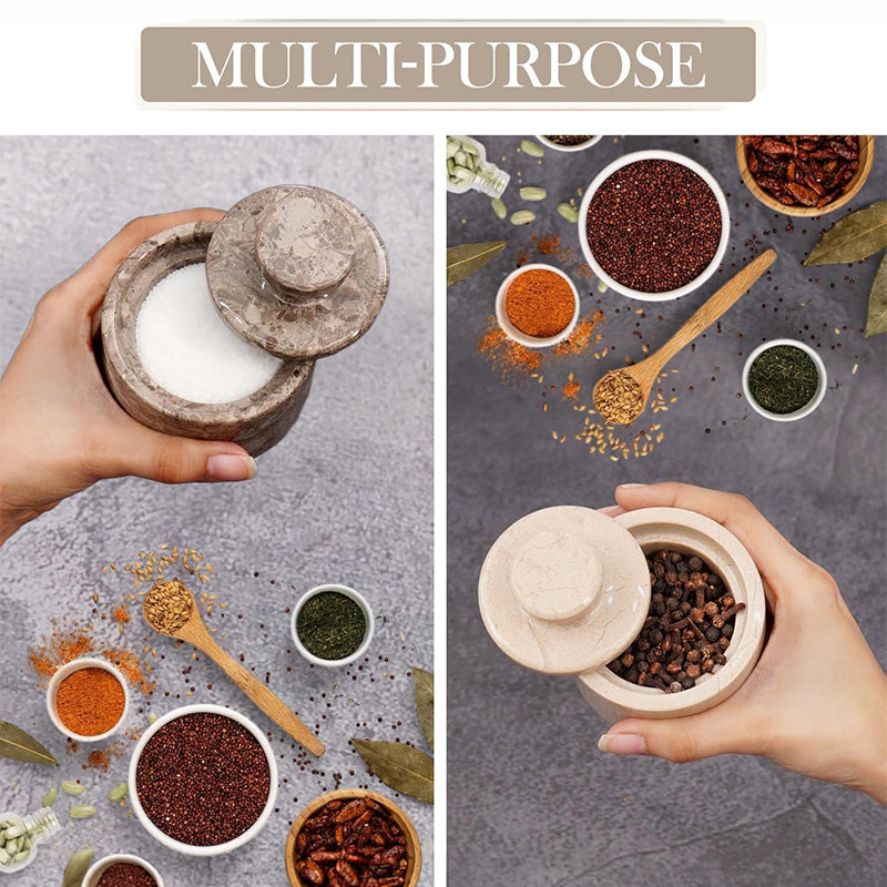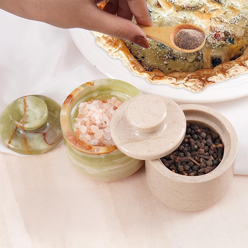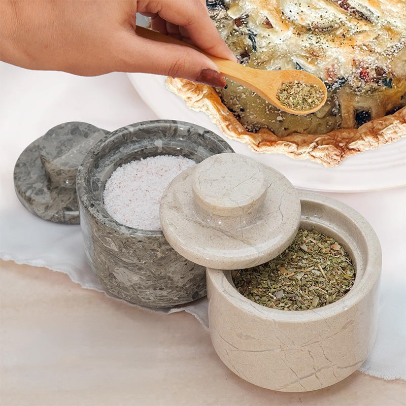 This beautifully constructed Marble Salt Cellar Set will improve the visual appeal of your kitchen by combining classic elegance with functionality. These beneficial marble bowls provide the kitchen a luxurious touch, whether you're an engaged home cook or loving of timeless style. This set is an appealing decorative element and is perfect for storing spices, salt, pepper, as well as small small items.